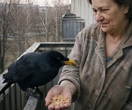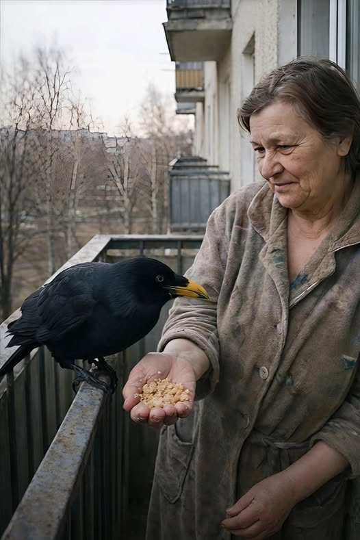 Elle se posait sur la rambarde métallique, inclinait légèrement la tête comme si elle saluait la vieille femme… puis attendait.